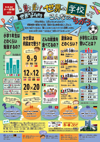 - 世界の学校を比べてみると、国ごとに大きなちがいがあることがわかります。そのちがいは、ただの習慣ではなく、歴史や文化、人々の考え方から生まれています。日本のあたりまえは世界のあたりまえではないことに興味をもってもらえるような内容となっております。
