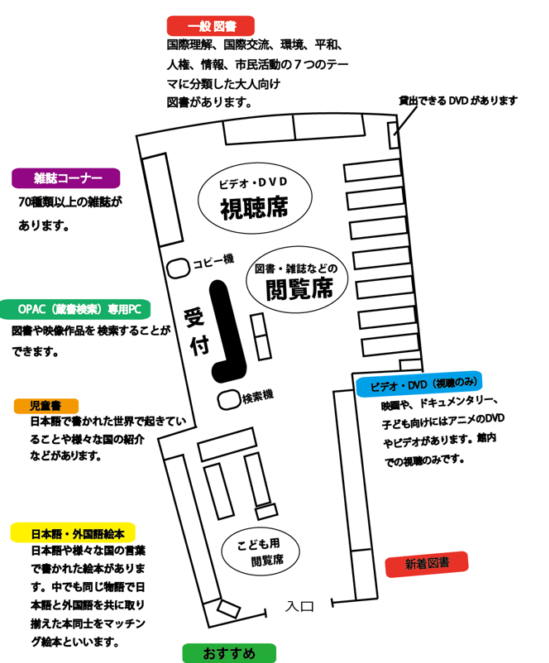 国際理解・国際交流・環境・平和・人権・情報・市民活動をテーマとした図書・映像資料・雑誌を所蔵しています。