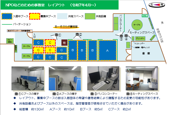 入居される各団体ごとの占有執務スペースとなる「レンタルブース」と、パソコンコーナーやミーティングスペースなどの「共同スペース」で構成されています。