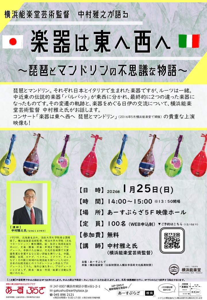 横浜能楽堂芸術監督 中村雅之が語る「楽器は東へ西へ」~琵琶とマンドリンの不思議な物語~