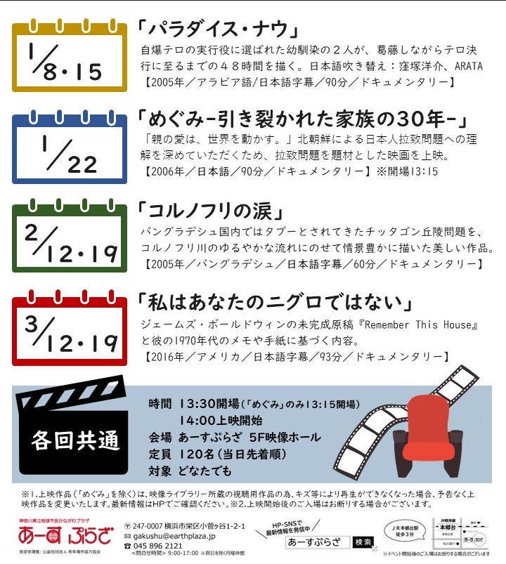 2/12・19 上映会「コルノフリの涙」※開場13:30 2026年02月19日(木) 日時第2・第3木曜日 場所あーすぷらざ5階 映像ホール 入場料無料 定員当日先着120名 ※定員に達した場合、入場はできませんので、あらかじめご了承ください 主催神奈川県立地球市民かながわプラザ(指定管理者:公益社団法人青年海外協力協会) お申込み不要 TEL045-896-2121 E-mailgakushu■earthplaza.jp(■を@に変更してください)