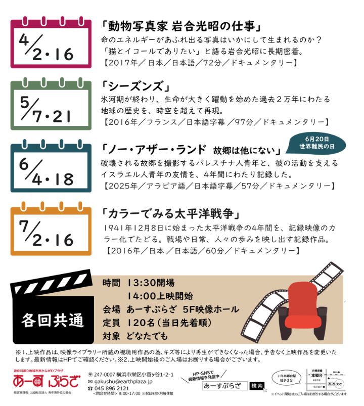 7/2・16 上映会 「カラーでみる太平洋戦争」※開場13:30 2026年07月16日(木) 日時第1・第3木曜日 場所あーすぷらざ5階 映像ホール 入場料無料 定員当日先着120名 ※定員に達した場合、入場はできませんので、あらかじめご了承ください 主催神奈川県立地球市民かながわプラザ(指定管理者:公益社団法人青年海外協力協会) お申込み不要 TEL045-896-2121 E-mailgakushu■earthplaza.jp(■を@に変更してください)