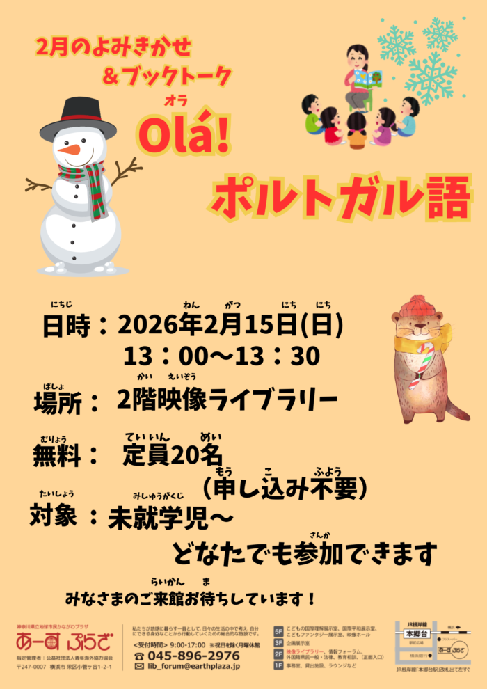 2月はポルトガル語についてのお話や読み聞かせをします。ポルトガル語で「こんにちは」は「Olá」と言うそうです。ほかにもいろんなポルトガル語がきけるかもしれません。どんなお話が聞けるでしょうか。
