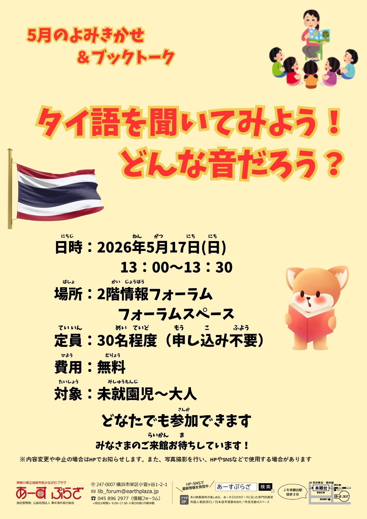 タイのおはなしをみなさんが聞きやすいことばで、読み聞かせをしてくれます。タイってどんな国で・どんなことばが聞けるでしょうか。